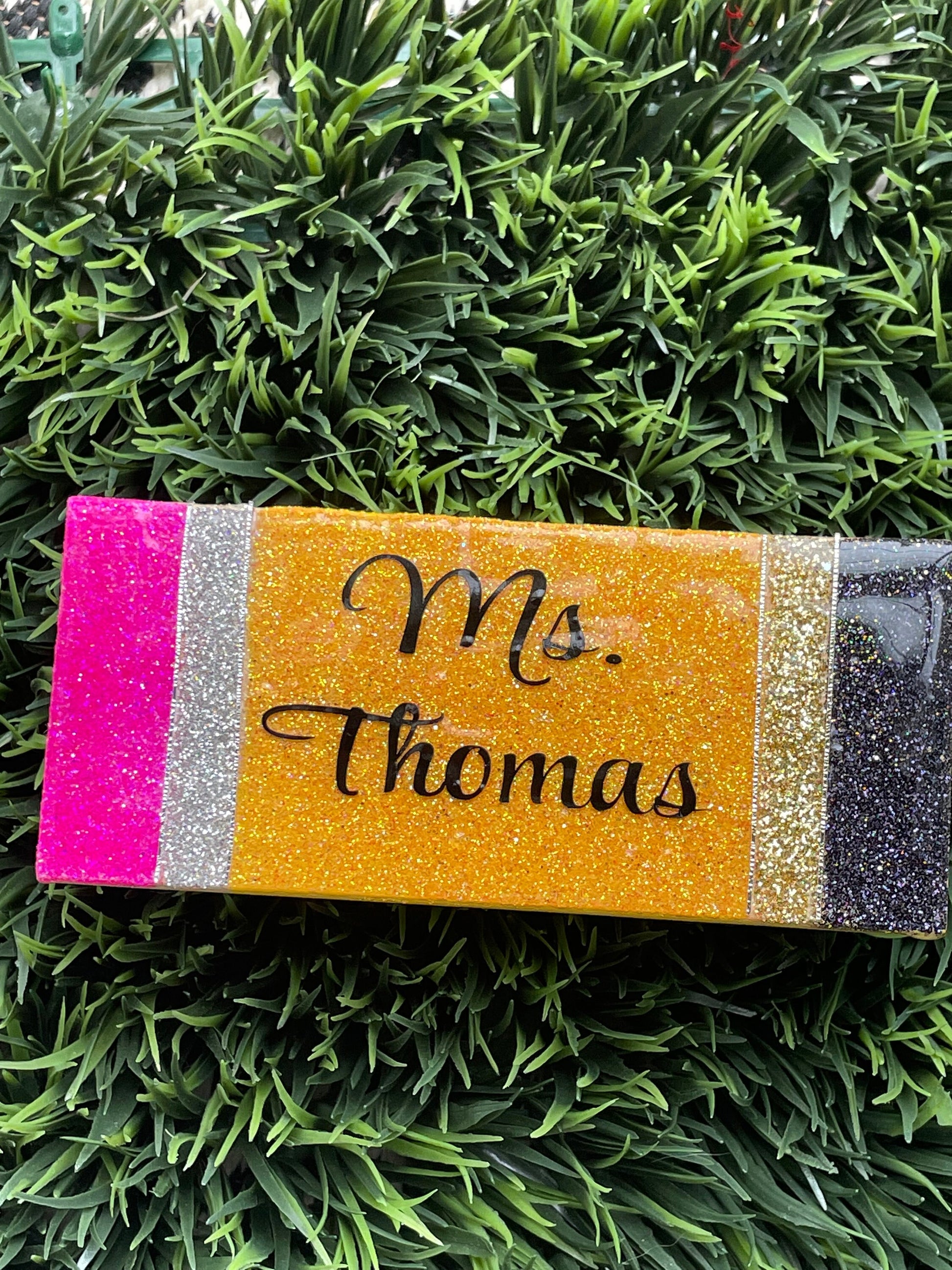 Pine eraser each eraser is glittered sealed with epoxy and can be personalized with a name. You have the choice between Pink composition or your traditional composition notebook design