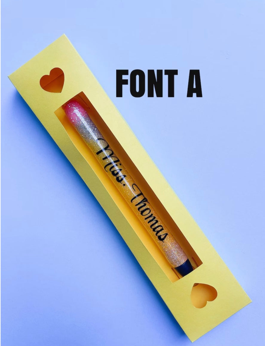 This pen is hand glittered, sealed with high quality resin to maximize the pens life!