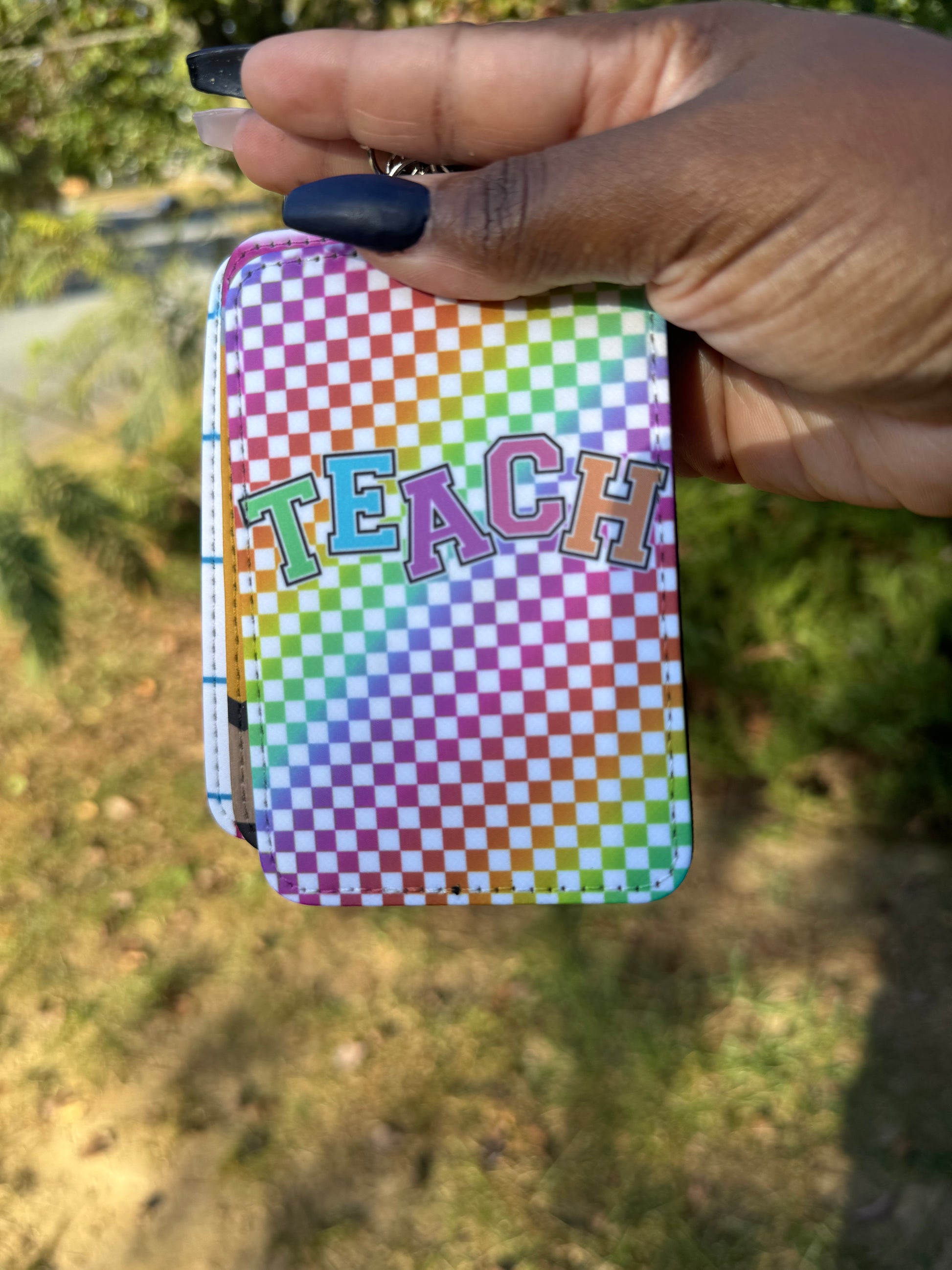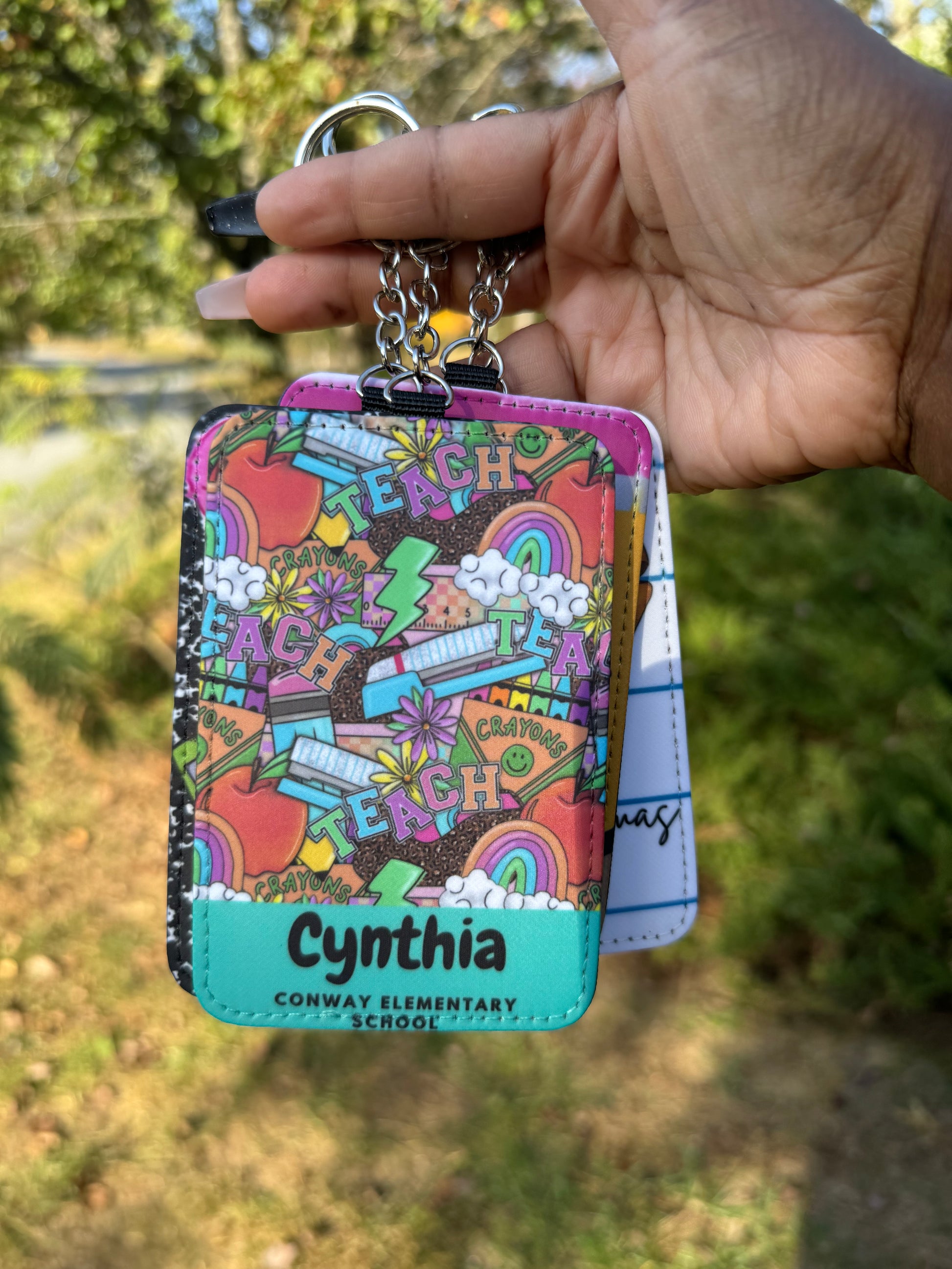 Keychain/Lanyard can also be used as a small wallet. There are to slots in the back that can hold a card or badge. Each cardholder measures about 4.13 x 2.95 inches/ 10.5 x 7.5 cm, making them the appropriate size for work IDs. The keychain itself measures approx. 3 inches x 4.5 inches.